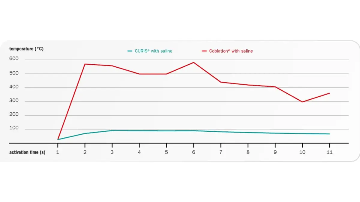 A comparison of the impedance-controlled 4 MHz radiofrequency technology with Coblation (operating at a frequency of 100.1 kHz, a factor 40 times smaller than CURIS©) proves the thermal benefits of 4 MHz radiofrequency during coagulation. Whereas Coblation reached excessive temperatures after saline injection*1, mean temperatures using the impedance-controlled CURIS© 4 MHz radiofrequency generator did not exceed the level of 100°C (see fig. below). These thermal advantages make the impedancecontrolled CURIS© 4 MHz radiofrequency generator the more suitable technology for the treatment of hypertrophic turbinates.7